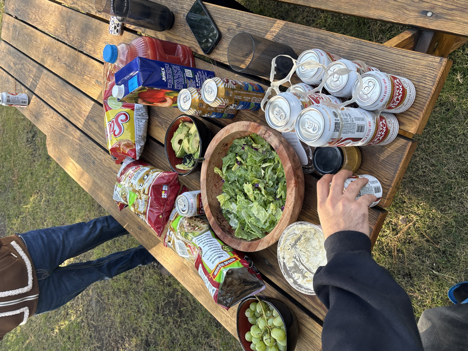 A picnic table is covered with food and drinks. There's a wooden bowl of salad, containers of grapes and avocado, bags of chips, a six-pack of beer, juice boxes, and a bottle. A person's hand is reaching for one of the beer cans. Sunglasses and a cell phone are also on the table. Someone in jeans and a jacket is standing near the table. Grass is visible surrounding the picnic table.