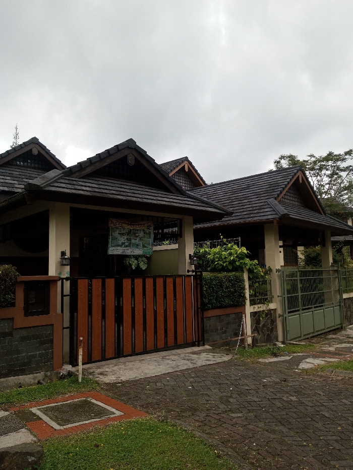 The photograph depicts a residential street with several houses visible. The houses are low-rise with distinctive dark tiled roofs and prominent eaves. Each property is fenced, with varying styles, including wooden slat gates and metal fences. The street is paved with patterned brickwork and patches of grass grow along the edges. The sky is overcast, suggesting a cloudy day. The overall setting evokes a quiet, suburban neighborhood.