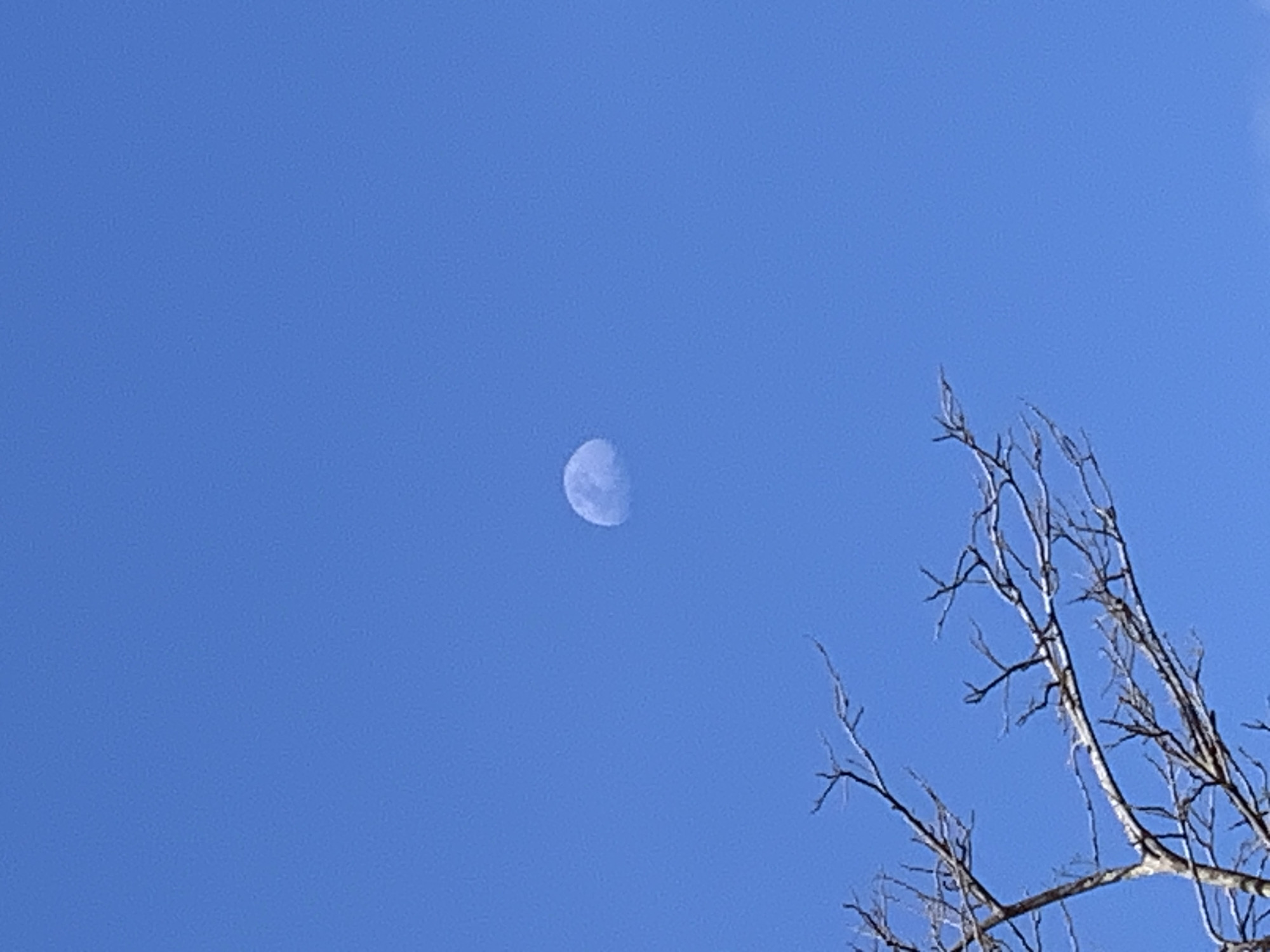 An outdoor daytime photograph, captured from บ้านบางรักษ์, Thailand, displays a clear, cloudless sky of a uniform medium-blue hue. In the upper-left quadrant, a pale white moon in a gibbous phase, approximately 60-70% illuminated, is visible with subtle surface texture. The moon's edges appear slightly diffused. Extending into the lower-left portion of the frame are the leafless, dark brown to grey, skeletal branches of a deciduous tree. These intricate branches crisscross and extend upwards and towards the right, forming a stark silhouette against the bright sky. No individuals, animals, artificial structures, or specific actions are present or occurring within the depicted scene.