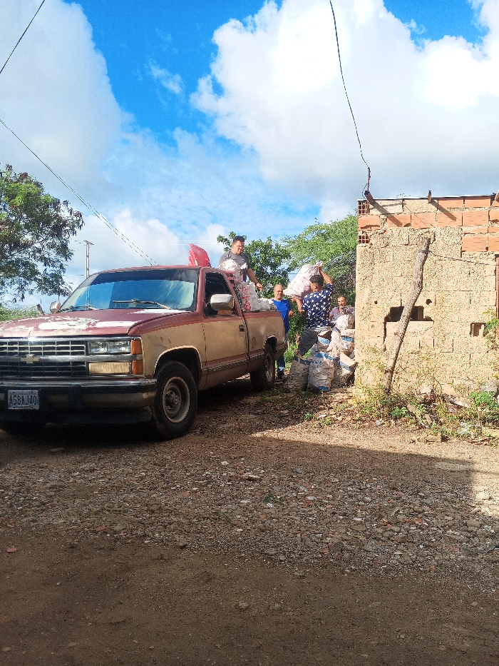 A maroon and tan Chevy pickup truck parked on a dirt and gravel road is being unloaded by several men. They are removing bags of what appears to be charcoal or similar material. Some bags are stacked on the ground. Behind the truck is a partially constructed brick and mud wall building and some lush green trees. The sky is blue with scattered clouds, suggesting a sunny day.