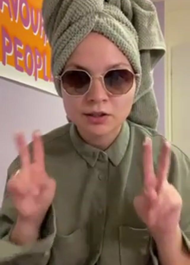 - ". A woman with a towel wrapped around her head and wearing sunglasses and an olive green button-down shirt speaks to the camera. She holds up two peace signs, one on each hand, and then dots some type of moisturizer on her face with her fingertips. Behind her is a pale purple wall and an orange poster with text." by FM-k41Xm2, licensed under CC BY 4.0