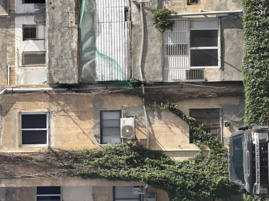 - "The image depicts an urban street scene in Tel Aviv-Yafo, Israel, focusing on two adjacent, weathered multi-story buildings and a parked vehicle" by FM-IQr1x1, licensed under CC BY 4.0