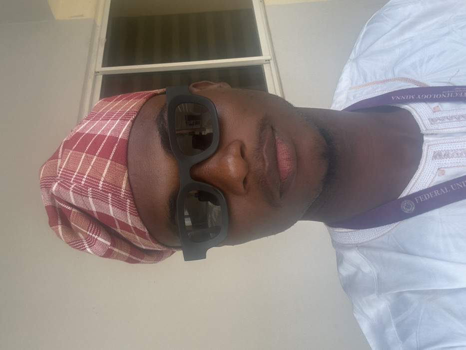 A single male individual, appearing as a young adult with dark complexion and light facial hair, is depicted in a medium-shot, facing directly towards the camera with a neutral expression. He wears a reddish-brown and white checkered traditional cap, black rectangular sunglasses with reflective lenses, and a white traditional kaftan-style garment featuring intricate embroidery on the chest. A purple lanyard with "FEDERAL UNIVERSITY OF TECHNOLOGY MINNA" printed on it is visible around his neck. The background consists of a plain, light-colored wall. To the subject's upper right, a window with dark frames and horizontal blinds is partially visible. The scene is brightly and evenly lit. This event occurs within the city of Baganakwo, Nigeria, with the subject's lanyard indicating affiliation with the Federal University of Technology Minna.