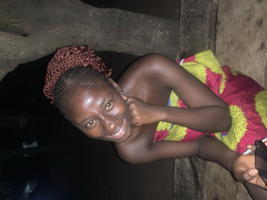 A smiling young woman with dark skin and braided hair is captured in a candid shot. She wears a colorful fabric wrap in yellow and red patterns. Her right hand is near her face. In her left hand, she holds a black object, possibly a phone. The background appears dimly lit, hinting at an indoor or sheltered environment, with blurred textures suggesting wood or rough surfaces. The image has a natural, unfiltered feel.