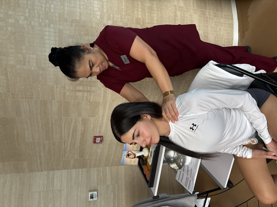 In a spa-like setting within Berry Islands, Bahamas, an adult female is performing a shoulder and neck massage on a younger female. The masseuse, identified by a "Sangeeta" name tag, wears a maroon short-sleeve uniform with her dark hair tied back. Her hands are placed on the shoulders of the seated younger female, who has long dark hair and is wearing a white long-sleeve Under Armour shirt and dark shorts. A white towel is draped over the back of the black chair the recipient is occupying. To the left, a black mobile cart holds a black tray on its upper shelf, containing smooth dark stones, a white herbal compress, yellow granular material, and two brochures, one referencing "AYURVEDA". The lower shelf holds a silver metallic bowl and several white paper sheets. The background wall is covered with light beige, horizontally-patterned tiles, featuring a white electrical outlet and a red fire alarm pull station. The flooring appears to be a light brown, smooth surface.