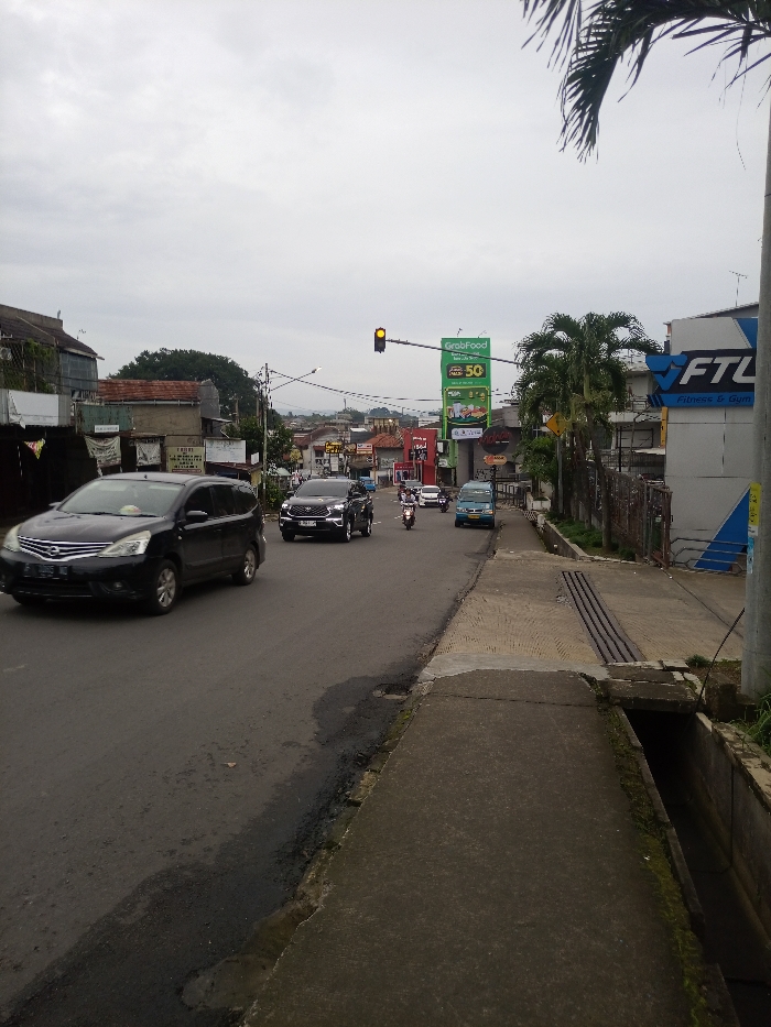 A street scene on an overcast day features several vehicles in motion, including a black minivan and a dark-colored SUV. A motorcycle is positioned in the middle of the street. A GrabFood advertisement sign is visible, along with an FTL Fitness & Gym sign. The scene is framed by palm trees and various buildings, indicating an urban or suburban setting. A sidewalk runs alongside the road, with a drainage ditch at the edge. A traffic light glows with a yellow light.