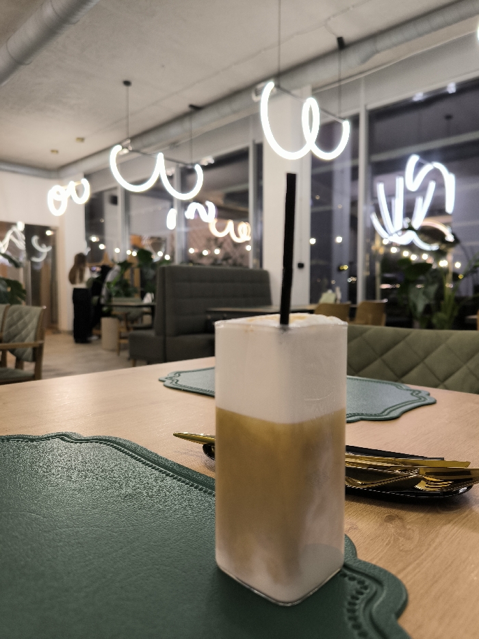 This image presents the interior of a modern café or restaurant in Vinnytsia, Ukraine. The primary subject is a tall, clear, square-based glass, positioned centrally in the foreground on a light-colored wooden table. The glass contains a layered beverage: a distinct white, frothy top layer above a light brown liquid, with a black straw inserted vertically. The glass rests on a dark green, scalloped-edge placemat. To the right of the glass, a set of golden-colored cutlery (fork, knife, spoon) is arranged on a small, dark rectangular tray, also placed on a dark green placemat. The background, softly blurred, reveals the establishment's contemporary design. Overhead, several white, curvilinear LED light fixtures are suspended from the ceiling, which is white and features visible metallic ventilation ducts. Large windows on the far wall show a dark exterior with blurred city lights, indicating it is nighttime. The seating includes dark green upholstered booth benches with vertical tufting, along with other tables and chairs, some featuring wooden frames and lighter upholstery. A single female individual, with long hair, is visible in the left background, standing near a reflective surface and appearing to interact with a mobile device. Green plants are intermittently placed throughout the interior. The exact address or specific name of the location within Vinnytsia is not ascertainable from the visual information provided.