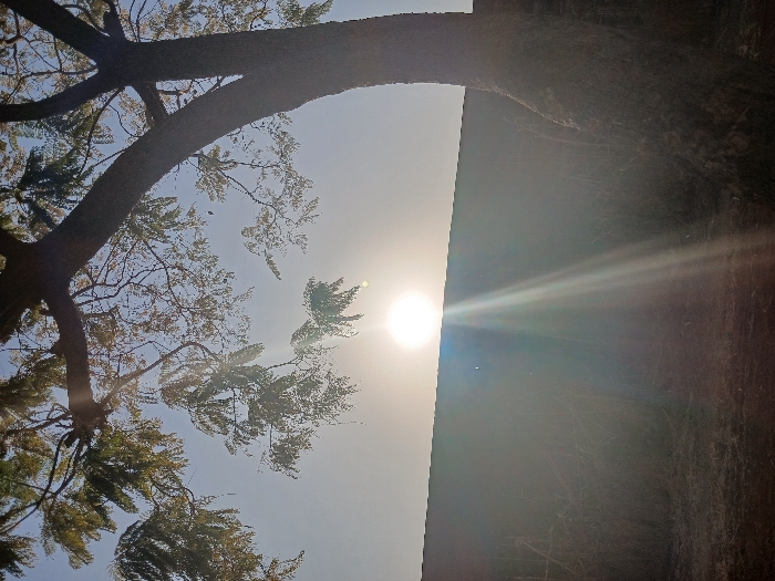 The image captures a sunlit sky through the branches of a tree. The sun is low in the sky, creating a bright glare. Part of the tree trunk is large and dominates part of the image, while the branches spread upwards, reaching towards the sun. The leaves are green and yellowish, illuminated by the sunlight. The sky is mostly clear, with a soft blue tone.