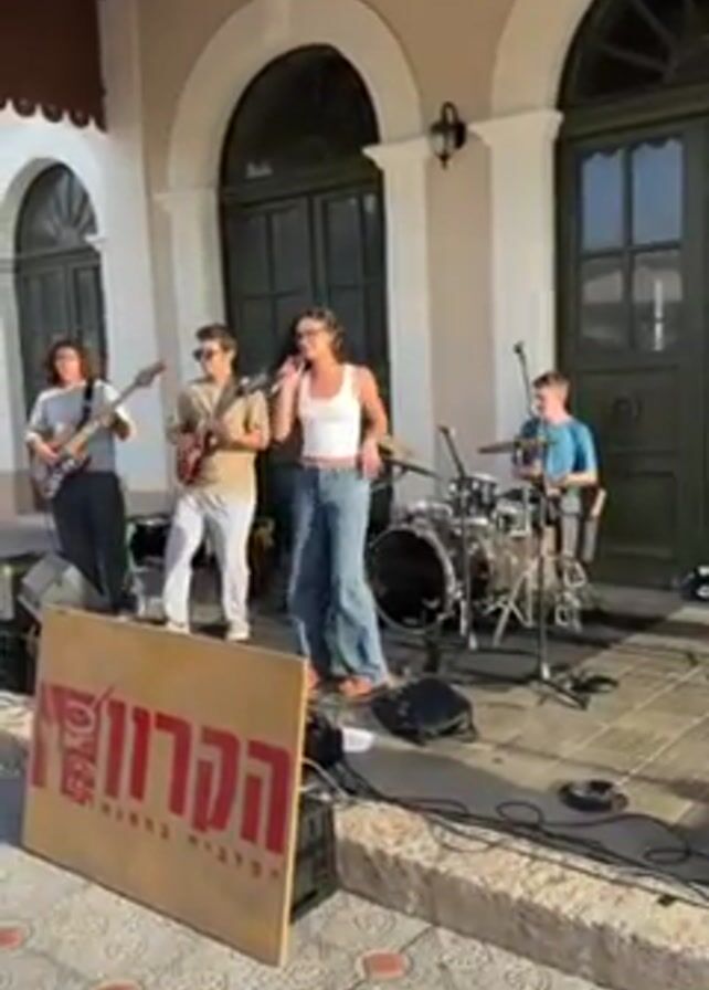 A band of four young people is playing music outdoors in front of a building with three arched doorways. From left to right, the band consists of a man playing an electric guitar, a man playing an electric guitar and wearing sunglasses, a woman singing and dancing, and a man playing drums. They are set up on a stone-tiled patio. A wooden sign with Hebrew writing is standing in front of the band. The building behind them is painted off-white, and the arched doorways are painted a dark green. The sun is shining.