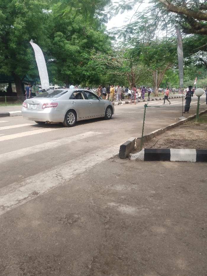 This image depicts an outdoor scene within the city of Ota, Nigeria, specifically identifiable as part of the Covenant University campus due to a visible banner. A paved asphalt road occupies the center, featuring a pedestrian zebra crossing on the left. A silver Toyota Camry sedan, model year approximately 2007-2011, is positioned in the mid-left, driving away from the viewer at a slight angle towards the left. Its Nigerian license plate, LND-705-EY, is visible on the rear. A small blue and white object is mounted on the vehicle's roof. To the right of the road, a raised curb is partially painted with black and white stripes. Beyond the curb, a cluster of approximately 10-15 adults is observed walking or standing on a paved or dirt path, some wearing patterned clothing. One individual, dressed in a red shirt and dark trousers, is seen crossing the road from right to left in the background. Another person stands further right near a white streetlamp. The environment is heavily treed, with dense green foliage creating a canopy overhead, particularly on the left and in the distant background. A tall, white, vertical banner or flag, bearing the partial text "Covenant University," stands on the far left, beneath the trees. A green metal pole with an attached green rope or wire extends from the foreground curb area towards the right. In the far distance, beyond the people, additional structures and possibly more tents or stalls are visible under the trees. The sky appears bright but somewhat overcast, discernible through gaps in the tree canopy.