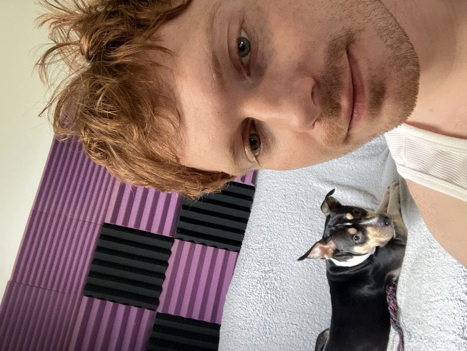 An indoor scene depicts an adult male and a dog positioned on a light-colored, textured couch. The male, with reddish-brown, disheveled hair, light complexion, and green-brown eyes, occupies the right side of the frame, wearing a white ribbed tank top and presenting a light mustache and beard stubble. He looks directly at the camera with a neutral expression. To his left, a small to medium-sized dog, primarily black with tan markings on its face and chest, lies on the couch. The dog has pointed ears and wears a cream-colored collar, looking towards the camera. A braided red, blue, and purple rope toy is partially visible near the dog's front paws. The background wall is fitted with sound-absorbing foam panels, predominantly purple with horizontal ridges, interspersed with square black panels featuring a convoluted or pyramidal texture. There are no visual elements within the image to confirm the specific location as Tel-Aviv, Israel.