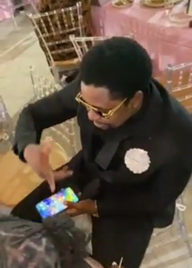 A man wearing sunglasses and a black suit is sitting and talking to a woman with dreadlocks, who is seated below him. The man is holding a phone in his left hand. He is gesturing with his right hand and smiling. The video then shows the man as he waves his hand and smiles while people are seated at tables in the background. The tables are decorated with pink tablecloths and flower arrangements. Many of the chairs around the tables are clear.