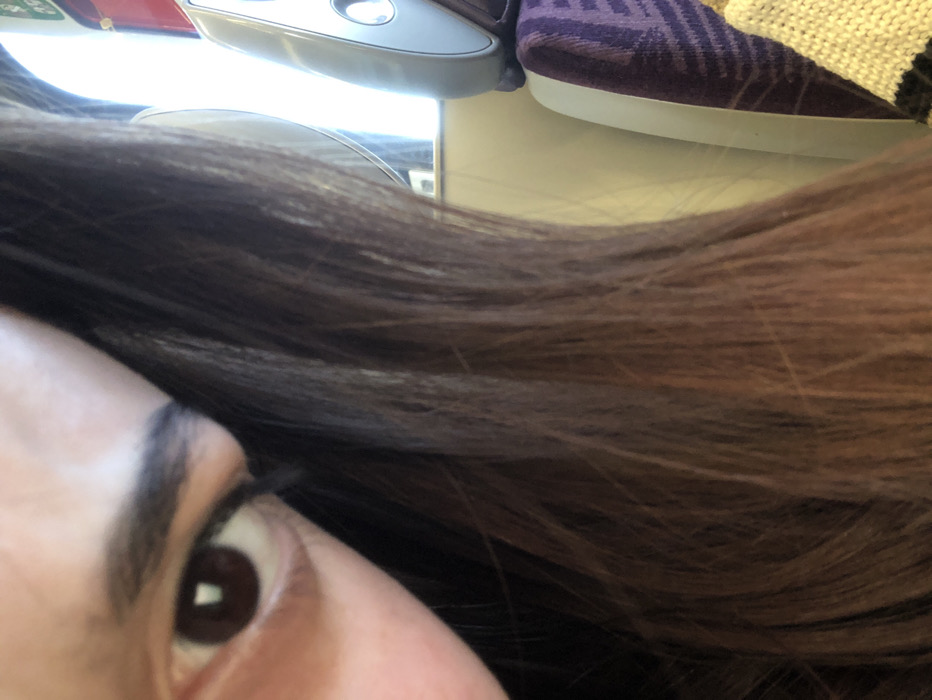 The image is a close-up, partial view of an individual within what appears to be the interior of a passenger transport vehicle, such as a train or bus. The location in the city of Eckwersheim, France, cannot be confirmed from the visual information presented. On the left side of the frame, the left eye of a person is visible, featuring a dark brown iris with a rectangular light reflection, and a dark, shaped eyebrow. Dark eyelashes are present, with visible eyeliner extending from the outer corner. The skin surrounding the eye is light-toned. To the right of the eye, and occupying the majority of the central and lower frame, is a mass of long, dark brown hair with lighter reddish-brown highlights, flowing downwards and to the right. In the background, to the right of the hair, elements of the vehicle's interior are discernible. A light-colored panel or wall segment is visible, partially obscuring a bright window. Above a seatback, a gray or silver-colored object with a circular indentation or button is mounted. Below this, a portion of a purple-patterned fabric seat cushion is visible. In the bottom right corner, a cream or beige knitted garment with a dark horizontal stripe is partially present. No specific actions or interactions are occurring.
