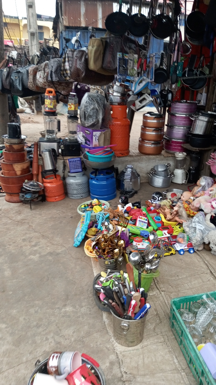 - "The image depicts an outdoor market stall in Ogbunike, Nigeria, displaying a wide variety of household goods on a concrete surface beneath a corrugated metal roof structure" by FM-lAMIj1, licensed under CC BY 4.0