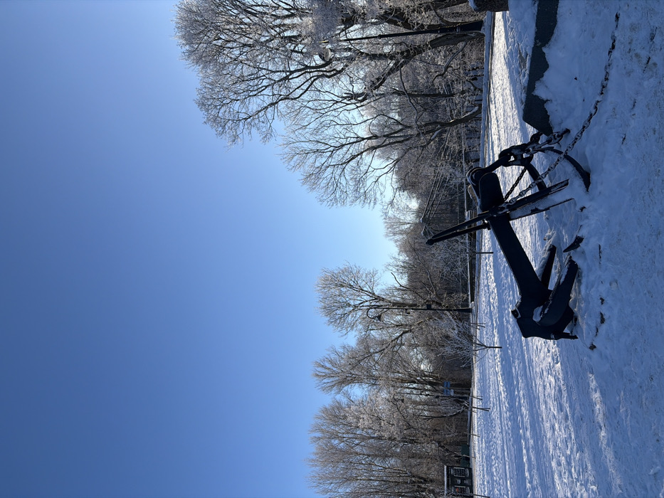 This image captures a static outdoor scene in Kronstadt, Russia, on a clear, bright winter day. In the foreground, a large, dark-colored anchor monument rests diagonally on a layer of undisturbed white snow. The anchor's left fluke is partially embedded in the snow, and a heavy metal chain extends from its crown, resting on the snow and disappearing out of frame to the lower right. Long shadows are cast across the snow, indicating direct sunlight from the left. The midground and background reveal a park-like environment with numerous bare deciduous trees, many of which are heavily coated in white frost or rime ice, particularly on their branches and twigs. Two dark streetlights are visible among the trees, one towards the left and another partially obscured on the right. A paved path or road is discernible further back, winding through the snow-covered terrain. The sky overhead is uniformly clear and deep blue, devoid of clouds. No individuals, animals, or active movements are present in the frame.