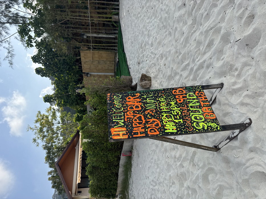 The image depicts an outdoor scene in Baan Wang Ta Kien, Thailand, characterized by a sandy environment. In the immediate foreground and midground, light-colored sand with subtle ripples covers the ground. Centrally positioned in the foreground is a dark-colored A-frame chalkboard sign, angled slightly to the right. The sign displays handwritten text in bright orange, green, and yellow, adorned with small star and dot motifs. Visible text includes "HI WELCOME TO BAR," "HAPPY BAR DAY & NIGHT," "HAPPY HOUR 1-5 PM," "COCKTAIL 99 B," and "SOUND & BATHS." The sign's wooden frame is partially embedded in the sand. Behind the sign, a dense line of trimmed green hedges forms a border. To the left of the frame, partially obscured by the hedges, is a building with light-colored walls, a brown tiled gabled roof, and a beige fabric awning extending over windows. To the right of the frame, behind the hedges, a bamboo fence and gate are visible, featuring a dark lantern-style light fixture mounted on a post. Further right, a section of green artificial turf is laid out on the sand in front of the bamboo structure. Tall tropical trees with dense green foliage rise in the background, extending towards a partly cloudy blue sky. No individuals are present in the scene.