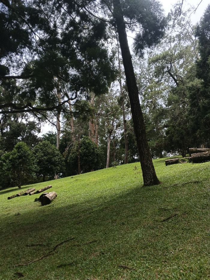 A vibrant green hillside slopes upwards, dotted with scattered logs and enveloped by an array of trees. A tall, dark-barked tree stands prominently on the right, its shadow stretching across the lawn. Other trees with lighter trunks rise in the background, partially obscured by lush foliage. The scene evokes a sense of tranquility and natural beauty within a forest setting.