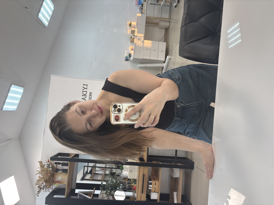 The scene depicts an interior space, likely a beauty salon or cosmetic clinic, located in Chaikovsky, Russia. A female individual, appearing to be in her 30s or 40s with long brown hair, is captured in a mirror reflection. She is wearing a black sleeveless top and blue jeans. Her left hand holds a gold-colored iPhone in a white case adorned with red lips and a gold MagSafe ring, while a plain gold ring is visible on her left ring finger. Her right hand rests on a white, reflective table in the foreground. The background shows white walls and a sloped white ceiling with two rectangular LED light panels. To the left, a black-framed wooden shelving unit displays items including dried floral arrangements (containing cotton bolls) and various small bottles. In the mid-ground right, a white fluted cabinet with gold-colored legs and handles holds more containers. The reversed text "LYDIA MEDC" is visible on the back wall's reflection, suggesting a business name. A portion of a black quilted leather chair is visible on the right. The floor appears light-colored. The individual is actively taking a selfie.