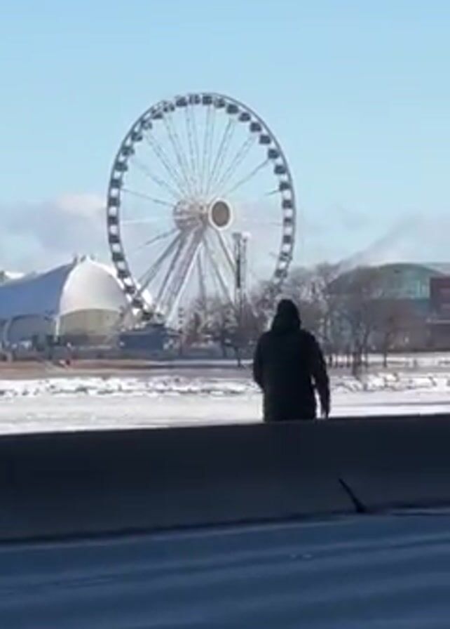 man in a dark jacket and hood standing in front of a large Ferris wheel on a sunny day. The Ferris wheel is white with a red center and is located on a pier with other buildings visible in the background. There is snow or ice on the ground near the water. A dark SUV drives by. The video is taken from a vehicle on a road separated from the pier by a concrete barrier.