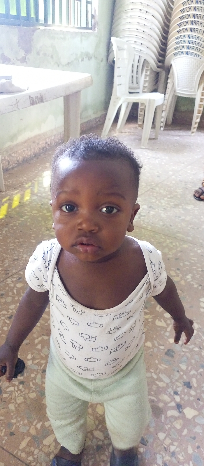 A young child, approximately one to two years old, with dark skin and short, curly dark hair, stands facing forward, looking directly at the camera