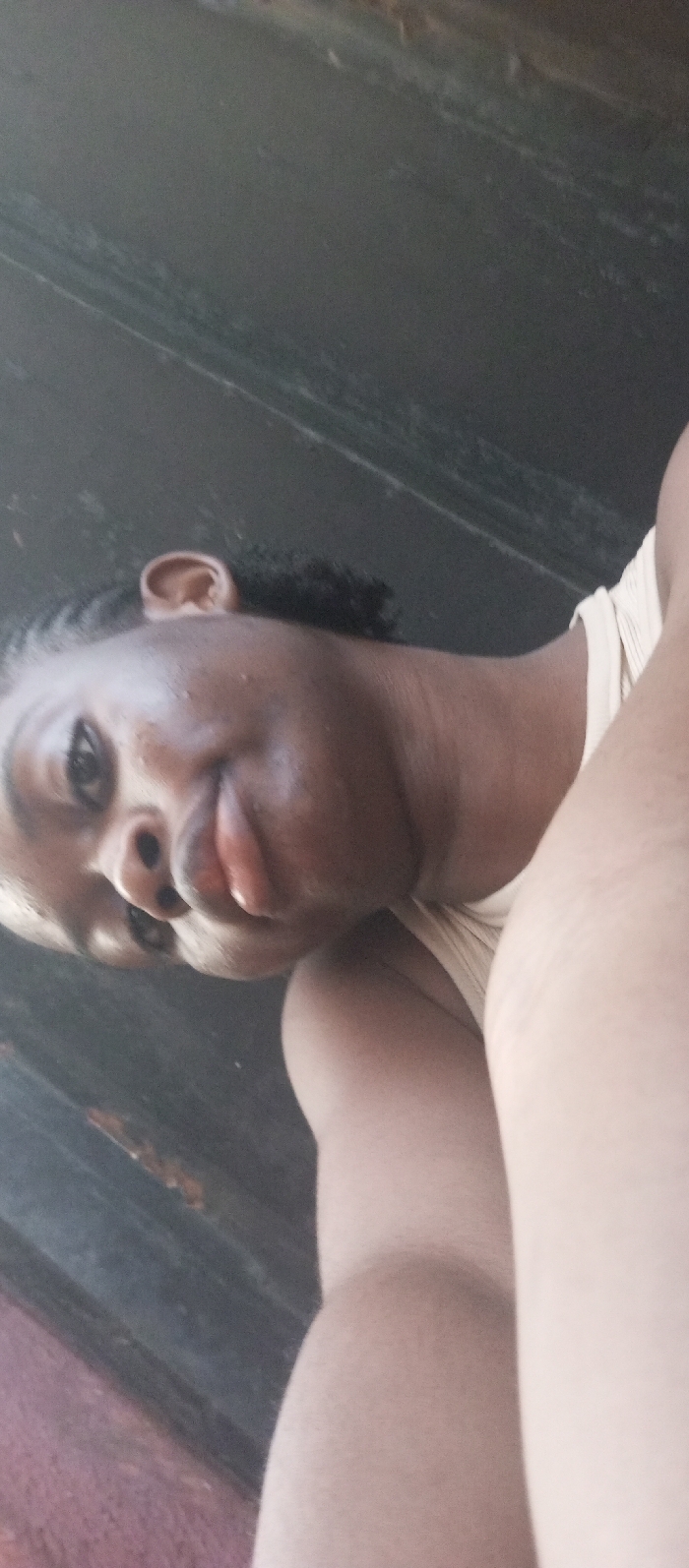 The scene is an interior setting in Abuja, Nigeria. A single individual, an adult with dark skin and dark braided hair, is positioned in the foreground, facing the camera at an oblique angle. The individual's expression is neutral, with lips slightly pursed. They wear a light-colored, ribbed top. The background is a dark, textured surface, possibly a weathered wall or door, exhibiting dark tones with subtle reddish-brown hues in areas. No other subjects or significant objects are discernible.