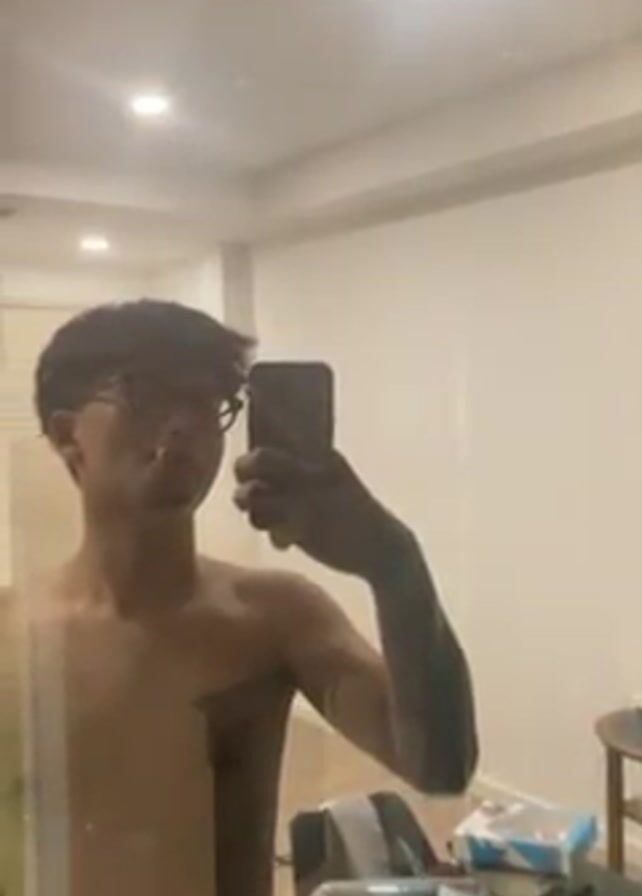 young man, likely in his late teens or early twenties, taking a selfie in a mirror. He has dark hair, wears glasses, and appears to be shirtless. He is holding a lit cigarette in his mouth. The mirror reflects a room with white walls, ceiling lights, a small table with various items on it, and a doorway. The man is facing the mirror, holding his phone with his right hand, and his left arm is partially visible. There is some dark ink or tape covering part of his chest and left arm.