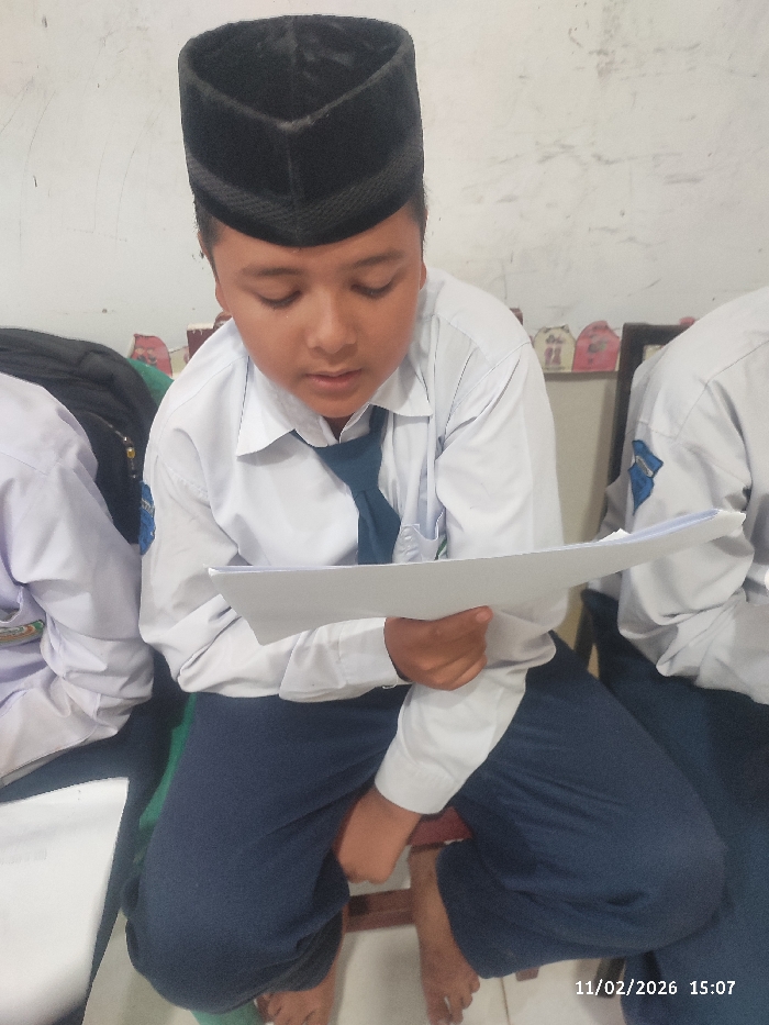 An indoor scene in Lhokseumawe, Indonesia, depicts a young male seated, focused on a document. The male, positioned centrally, wears a white long-sleeved shirt, a dark blue tie, dark blue trousers, and a black peci (traditional cap). He is barefoot, seated on a low wooden stool, holding a single sheet of white paper or a small booklet in his left hand, with his gaze directed downwards at the material. His right hand rests on his lap. Portions of two other individuals, also in white shirts and dark trousers, are visible on the left and right, partially cropped. The person on the left has a dark backpack or bag beside them. The person on the right displays a blue emblem on their upper right sleeve. The background consists of a plain, light-colored wall with some surface texture. Several small, decorative house-shaped items are affixed to the wall behind the main subject. A timestamp in the lower right corner indicates "11/02/2026 15:07".
