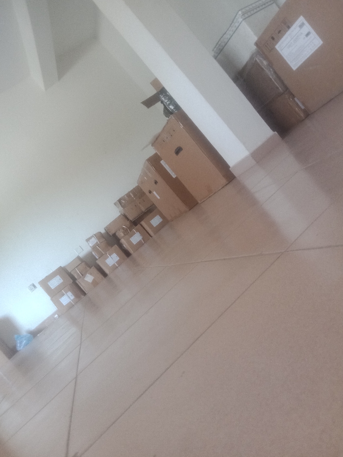 The image depicts an indoor scene in Gandu Albasa, Nigeria, characterized by numerous stacked cardboard boxes lining one wall of a well-lit room
