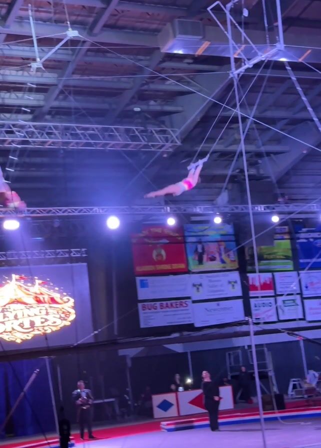 two trapeze artists performing in a circus tent. One artist in a pink and white outfit hangs from a trapeze while the other, in a white and pink outfit, hangs above them. The artist on the lower trapeze releases their grip and swings forward, making a flip in the air before being caught by the other artist. In the background, a large screen displays the circus' logo, and several people stand watching below. The lighting is bright, with colorful spotlights illuminating the performance area.