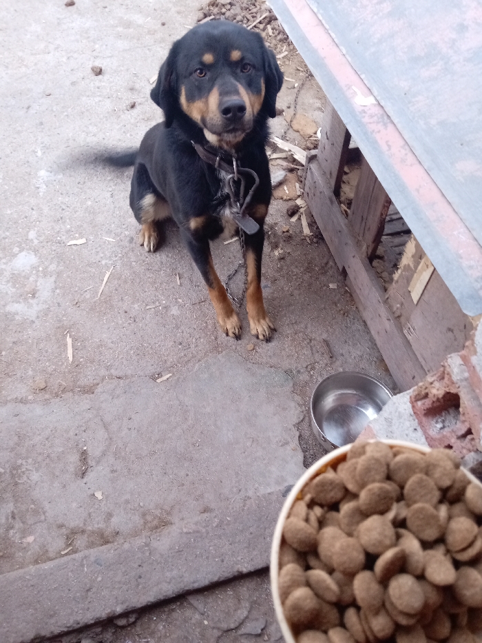 The scene depicts an outdoor setting in Войводино, Bulgaria. A medium-sized dog, predominantly black with tan markings on its muzzle, eyebrows, and lower legs/paws, is positioned in the upper-mid frame, facing directly towards the viewer. The dog wears a dark collar from which a metal chain is attached to a clasp visible on its chest. Its eyes are dark and alert, and its ears are folded down. The dog is standing on a grey concrete or cement ground, which occupies most of the left and lower central portion of the image. Scattered debris, including small dirt clumps and wood fragments, are visible on the ground. To the dog's right, a utilitarian structure composed of light-colored wooden planks and rough timber supports is present. Adjacent to this structure, a shiny, empty metallic dog bowl rests on the concrete. In the lower right foreground, a light-colored bowl filled with numerous brown, round pieces of dog kibble is partially visible and out of focus. Elements resembling red brick fragments are also present near the metallic bowl and wooden structure. Natural daylight illuminates the scene, casting soft shadows.