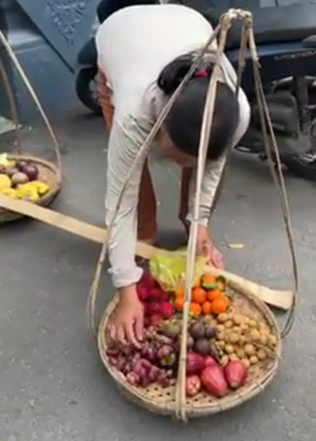 A woman is selling fruit from two woven baskets balanced on her shoulders by a bamboo pole