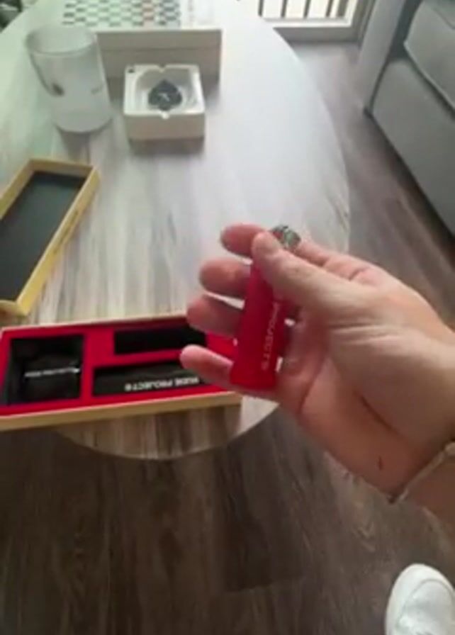 A hand is holding a red lighter with white text that reads "High on Hell" and a devil figure on the side. The lighter has a silver top. The person flicks the lighter and a flame appears. The lighter is held above a box set with a red interior, which contains a roll of protection film and a black cylindrical object labeled "NUDE PROJECT". On the table nearby is an ashtray with a spade design, a glass, a box, and a chess board. A sliver of a gray couch is visible in the background. The floor is wood.