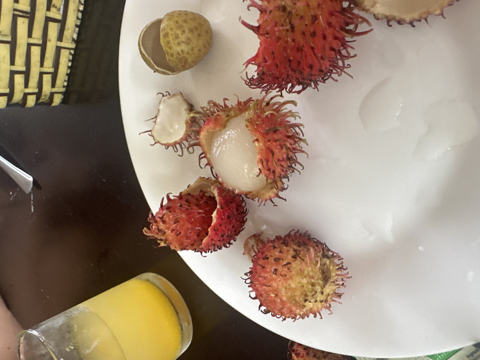 Rambustans, peeled and unpeeled, are arranged on a white plate