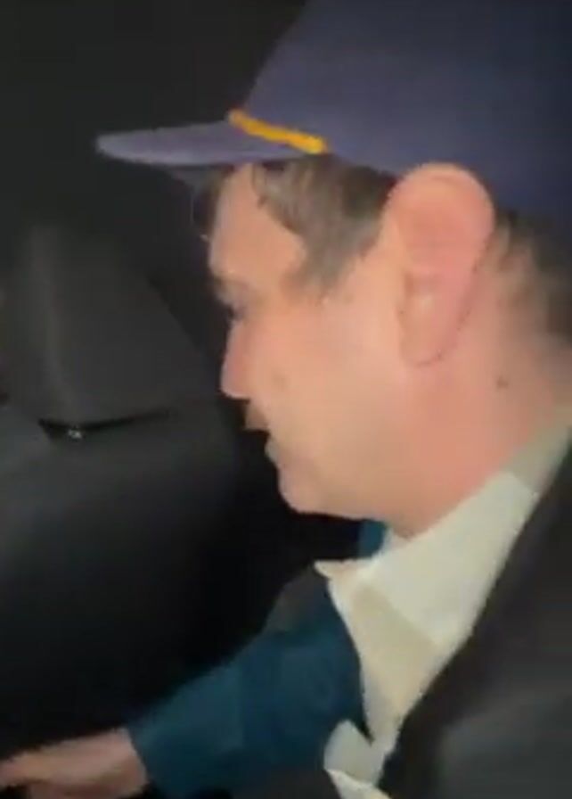 two people inside a car. One person has a mustache and is wearing a blue jacket. The camera is pointed at them. The other person is lying down in the backseat, with a tan and white dog sitting on their chest. The dog is wearing a collar and is looking towards the front of the car.