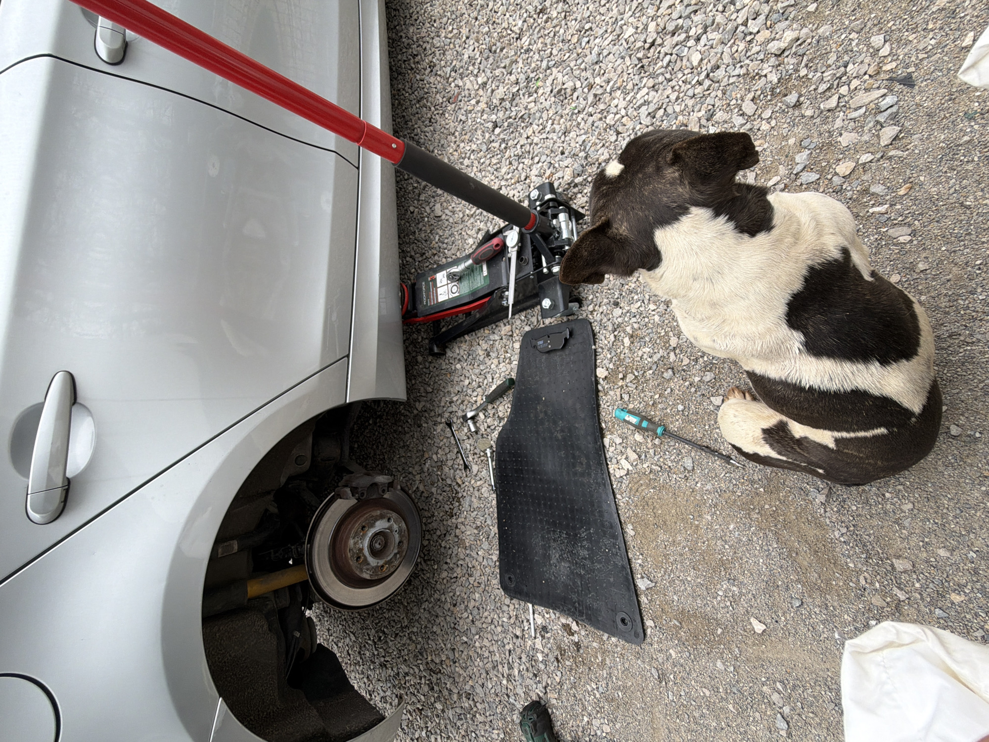 A silver car is jacked up, its front left wheel removed, revealing the brake rotor. Tools are scattered on the ground, along with a black car floor mat. A black and white dog sits nearby, looking towards the car. The scene is set on a gravel surface. The location is Balinovtsi, Bulgaria.