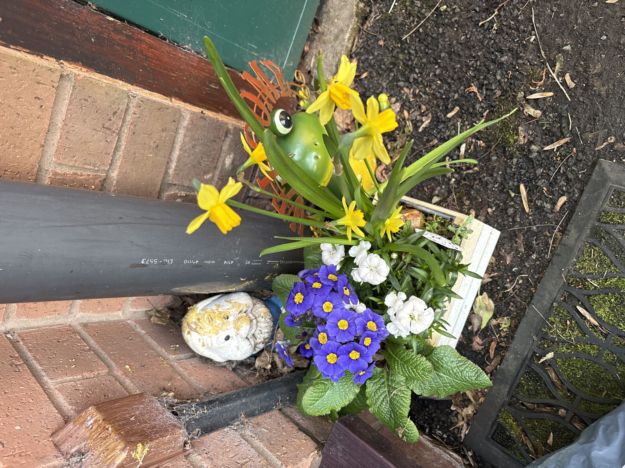 The image presents a ground-level view of a flower arrangement located in what appears to be an outdoor setting. Positioned near a brick wall and a grey pipe, the arrangement features a white rectangular planter filled with a variety of flowers. Predominant are yellow daffodils, blue and purple primroses with yellow centers, and white flowers. A decorative metal frog ornament with a green head and orange accents is placed among the flowers. Next to the pipe, there is a small white decorative item, possibly a garden ornament. The ground surrounding the arrangement consists of dark soil, interspersed with dead leaves and debris. A dark-colored welcome mat covered in moss is partially visible at the right edge of the frame. The location appears to be a domestic garden or patio in the city of Minsterley, United Kingdom.
