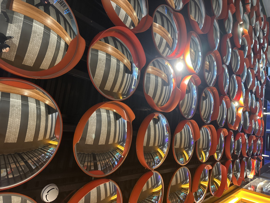 The image displays an indoor scene capturing a ceiling art installation located on the lower ground floor near the Lonsdale Street entrance of Emporium Melbourne, Melbourne, Australia. The ceiling is densely covered with approximately 50-60 individual convex mirrors, each encased in a vibrant orange, circular or oval-shaped frame, affixed to a dark overhead surface. A white, circular smoke detector is visible on the ceiling in the upper-left quadrant. The mirrors reflect the environment below, primarily a distinctive patterned floor consisting of wide, alternating stripes of light grey and dark grey paving, arranged in a curvilinear design. Several mirrors also prominently reflect sections of a curved architectural feature, appearing as warm, reddish-brown wooden elements. In the reflection within the top-right mirror, a person is visible from the waist down, wearing dark trousers and black shoes, standing on the striped floor. Less distinct human reflections are present in other mirrors. Multiple bright light sources are reflected throughout the mirrored surface, illuminating the installation.