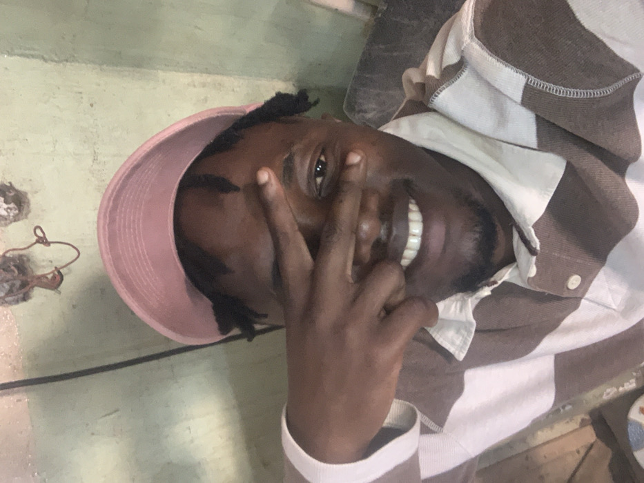 The image displays a head-and-shoulders portrait of an adult male, dark-skinned, with short dark dreadlocks, and a light beard/stubble. He wears a light pink baseball cap and a brown and off-white horizontally striped polo shirt with a white collar. His left hand is raised, forming a "V" gesture with the index and middle fingers, partially obscuring his left eye and forehead. His right eye is visible, and he exhibits a wide smile, exposing white teeth. The specific location in Jos, Nigeria, is not discernible from the image. The background consists of an indoor, worn, pale green/beige wall with visible stains and patches of plaster damage. In the upper right quadrant, two circular indentations or holes are visible in the wall, with exposed red and brown electrical wiring hanging loosely from them, indicating a removed or unfinished electrical fixture. A dark, indistinct object, possibly a piece of furniture, is partially visible behind the subject's right shoulder. A dark vertical line, resembling a cable or pipe, runs along the left side of the frame.