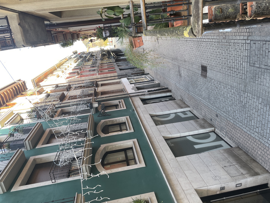 The image depicts a narrow, downward-sloping cobblestone street in Azpeitia, Spain, observed from an elevated balcony vantage point. On the left, a multi-story building presents a teal-green upper facade with arched windows and black metal balconies, festooned with white, unlit decorative string lights. The ground level of this building features a light grey stone cladding with large commercial display windows; one window displays "gaia" text, and another exhibits prominent "LIC" text. An intercom panel is affixed to the lower left wall. The immediate right foreground shows a partial wooden and metal balcony railing with multiple potted plants, including trailing green foliage in a terra cotta pot. Across the street, a sequence of multi-story buildings lines the right side, displaying varying facade colors including beige, red, and cream, all featuring balconies and windows, some equipped with closed brown roller shutters. Additional white string lights are strung horizontally across the street, connecting buildings. A single square metal drain cover is visible on the cobblestone pavement. A black, ornate streetlight with a glass lantern is mounted on a building facade on the right side of the street. The street is clear of people and vehicles, illuminated by bright daylight under a clear sky.