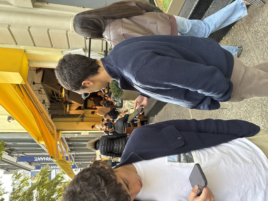 The image captures a bustling street scene in Tribeca, New York City, United States, specifically outside "The Merchant" restaurant located at 112 W Broadway. The restaurant features prominent bright yellow retractable awnings extending over an outdoor dining area, where approximately a dozen patrons are seated at tables with white tablecloths, engaged in dining and conversation. A blue banner above the awnings clearly displays "RESTAURANT" and "THE MERCHANT." In the foreground, two male individuals stand on the sidewalk, both focused on their smartphones. The male on the left, partially visible, has curly brown hair, wears a white t-shirt with a graphic print on the left chest, and a dark blue knitted zip-up jacket with a flap pocket on the left arm. He holds a black smartphone in his left hand, looking downwards. The second male, positioned slightly to the right and viewed from behind, has short dark hair, wears clear-framed glasses, a dark blue knitted zip-up jacket, and light brown trousers. He holds a black smartphone in his right hand. In the midground to the right, a female walks away from the camera, displaying long dark hair, a light brown leather jacket, light blue denim jeans, and dark flat shoes adorned with metallic studs. Various other pedestrians and diners, indistinct due to distance and focus, populate the background and outdoor seating area. The scene is illuminated by strong sunlight, casting shadows. A leafy green tree is visible on the left, and the street features a paved sidewalk. The restaurant building exhibits light-colored facade elements with visible internal lighting fixtures.