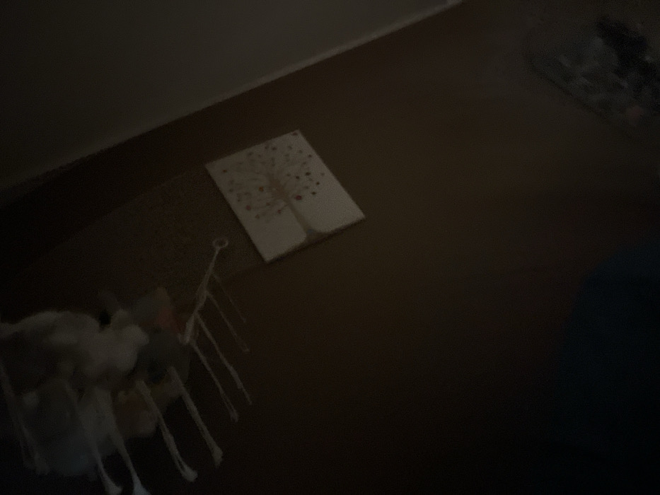 A greeting card featuring a tree with red and pink embellishments rests on a dark surface. To the left, a blurry, multi-colored mobile-like object hangs with thin white strands. In the upper right, a blurry image of a framed print or poster is visible. The background is dimly lit, making it difficult to discern distinct features. A hint of blue indicates another object possibly in the lower right corner.