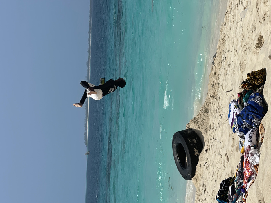 The image displays a sunny beach scene in Zanzibar, Tanzania. A young male, wearing a black long-sleeved shirt, white shorts, and black leggings, is captured mid-air performing a backflip over the turquoise ocean at the edge of the white sandy beach. His body is inverted, with his head tucked towards his chest. On the left side of the foreground beach, a black vehicle tire is partially embedded in a small sand mound. To the left foreground, a pile of various colorful patterned fabrics and clothing, including one with "Hakuna Matata" visible, rests on the sand. The ocean water is clear and turquoise near the shore, transitioning to a deeper blue further out. In the middle ground, a traditional dhow with a white sail and a small yellow boat are visible on the water. A low-lying landmass or island with sparse vegetation stretches across the horizon under a clear, light blue sky.