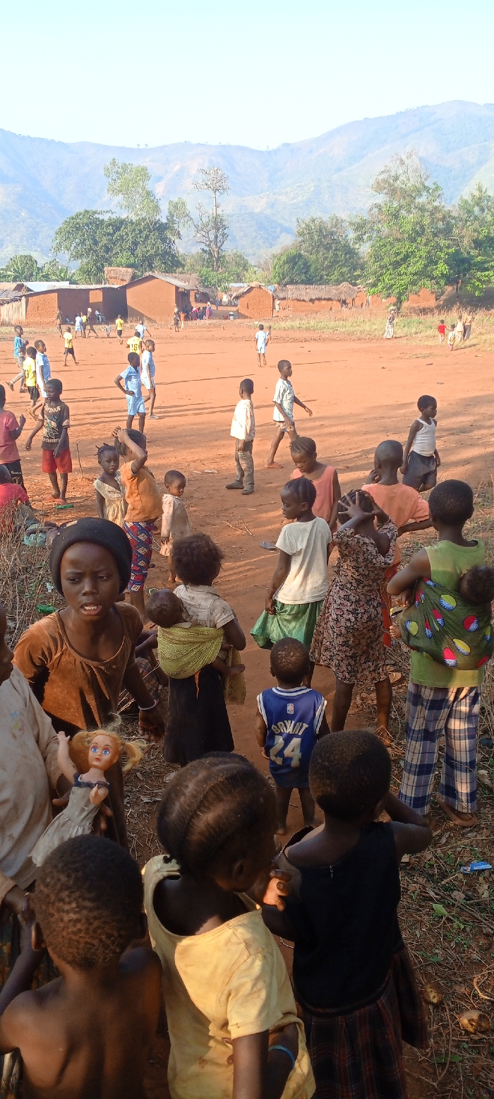 The image depicts an outdoor scene in Konongo, Democratic Republic of the Congo, captured under bright, diffused daylight. Approximately 30-40 individuals, predominantly children, are scattered across a wide, reddish-brown dirt terrain. In the immediate foreground, a group of 10-15 children is observed. A girl positioned to the left looks towards the camera with an open mouth, holding a blonde doll dressed in a light gown. Behind her, a child carries an infant in a yellow-green fabric sling. To the right, another child carries an infant in a patterned fabric sling, while a young boy in a blue basketball jersey with "BRYANT 24" printed on the back faces away. Other children in this section wear various simple clothing, including t-shirts and dresses. The ground here is dry reddish-brown dirt with sparse vegetation and minor debris, including a blue wrapper. In the midground, an open expanse of reddish-brown dirt accommodates numerous children. A group of approximately five children in the distant midground appears to be engaged in playing with a light-colored ball, resembling a soccer game. Other individuals are seen walking or standing throughout this area. The background features a rural village composed of multiple single-story structures constructed from reddish-brown mud bricks, with simple roofs. Green trees and bushes are present among and around these buildings. Dominating the far background is a series of large, hazy, green-covered mountains rising under a clear, pale blue sky.