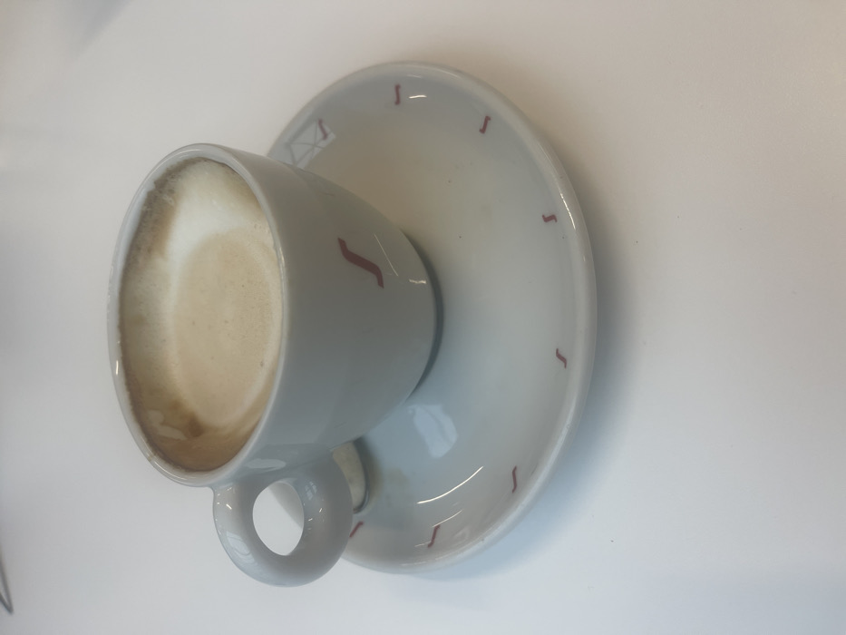 - "A white ceramic cup holding a light brown beverage topped with foam is centered on a matching white ceramic saucer" by FM-ZDm2H3, licensed under CC BY 4.0