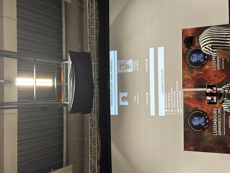 The image displays a screen showing arm wrestling competition information. "Senior 85 KG Left-Final Rematch" is highlighted, with Theo Masullo versus Cyprien Valerian, both from France. A list titled "Current Results" follows with names like Nicolo Monti and Wollert Krohn ranked in order. Next to the screen is a banner for Luxembourg Armwrestling Federation, with its logo, website address, and "Sponsored By".