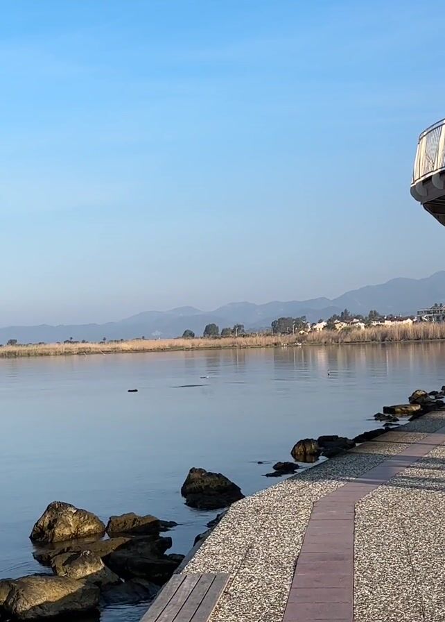 calm, clear body of water with a bird flying over it on a sunny day. The water is surrounded by a shoreline with rocks and a pebble path. Mountains are visible in the distance. There are reeds and some vegetation on the opposite shore. A bridge structure is partially visible on the right side of the frame. The bird dips into the water.