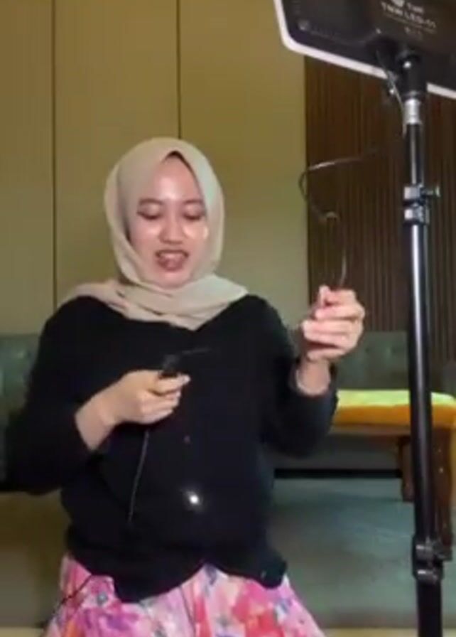 A woman wearing a hijab, a black cardigan, and a pink floral skirt kneels on the floor in front of a large LED light on a stand. She holds a small black microphone with a long wire. She smiles and looks directly at the camera, seemingly testing the microphone by saying "1, 2, 3." Behind her is a wall with vertical wood paneling, a brown couch, and a small table with a glass on it.