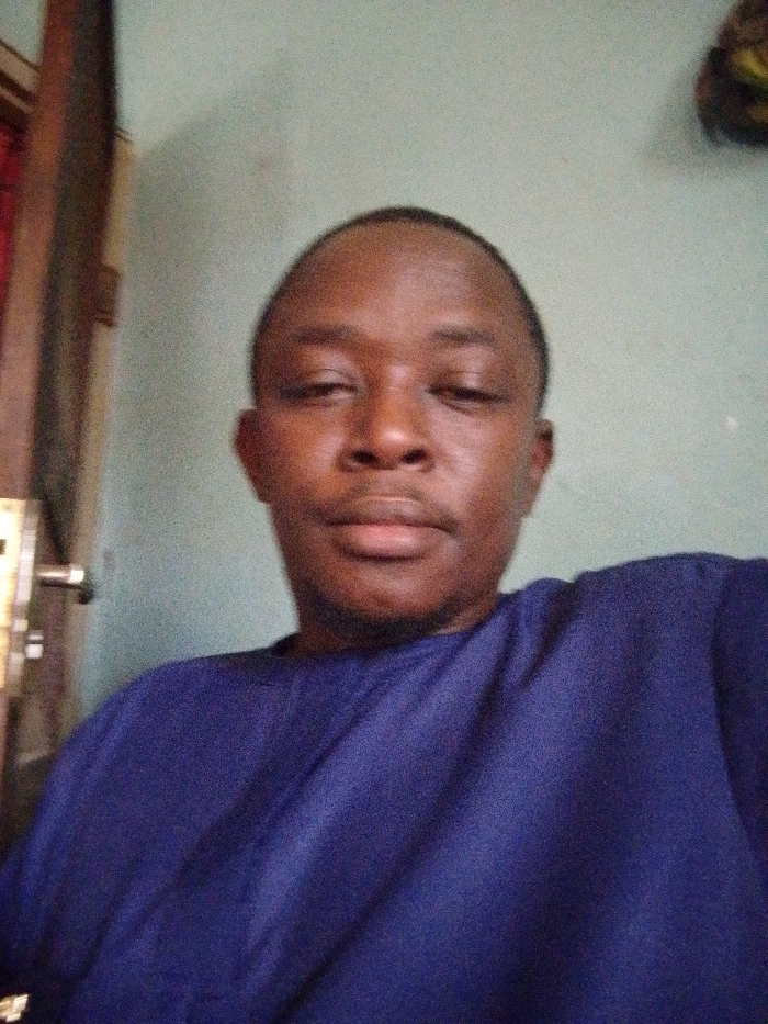 An adult male, with dark skin and a closely cropped hairstyle, is depicted in a frontal, chest-up photograph