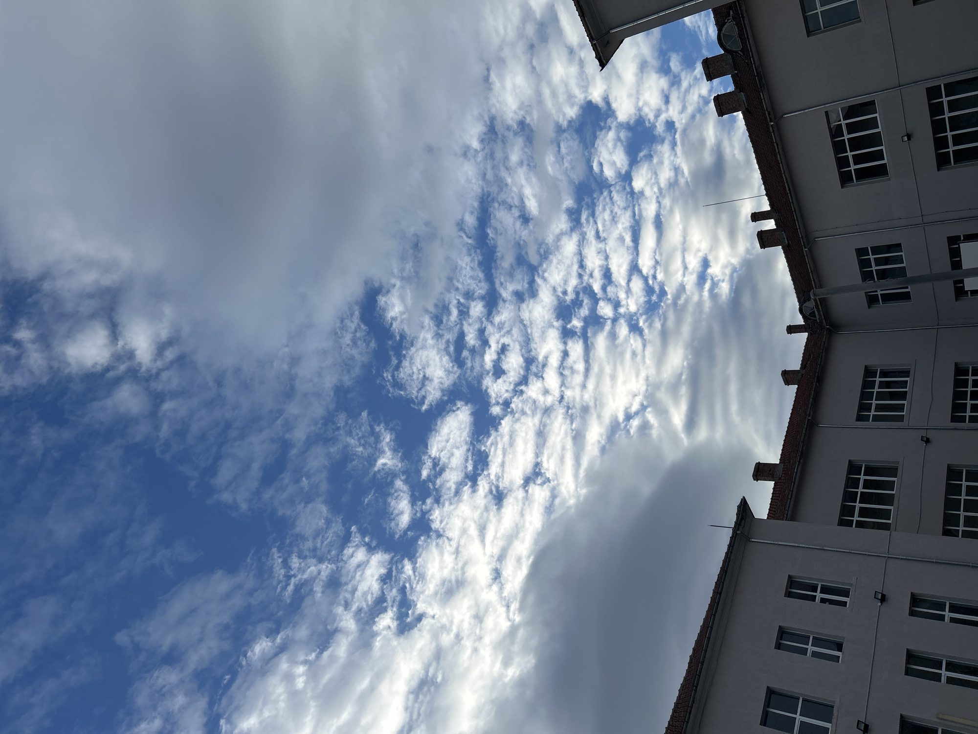 A low-angle shot shows a partial view of a light-gray building with a red tiled roof and numerous rectangular windows, positioned diagonally to the right. The structure is situated against a backdrop of a partly cloudy sky, dominated by a mix of light, scattered clouds and darker, overcast formations. The sky appears blue in the sections with thinner clouds. The photograph seems to have been taken within a courtyard or narrow space between buildings, indicated by the close proximity and upward angle. The location is Shumen, Bulgaria.