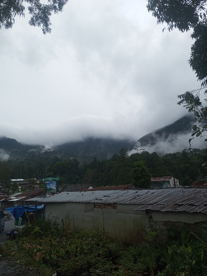 The image displays an outdoor scene in Babaliya Mal., India, under an overcast sky. The upper portion of the frame is dominated by a uniform gray cloud layer, with dark green tree branches partially visible in the top left and right corners. In the background, densely forested mountains are significantly obscured by low-hanging clouds or fog that cling to their slopes. The mid-ground features a cluster of structures, predominantly with corrugated metal roofs, though some tiled roofs are also visible. A rectangular sign with white text on a blue background, partially legible as "KILOMETER..." and "ACENG," is positioned within this settlement. A vehicle, partially covered by a blue tarpaulin, is discernible on the far left. The foreground consists of the roofs and upper walls of multiple single-story buildings, characterized by weathered, corrugated metal roofing and discolored concrete or block walls. The ground immediately in front of these structures is covered with dense, uncultivated green vegetation. No individuals are visible. The scene is illuminated by diffused light, indicative of heavy cloud cover.